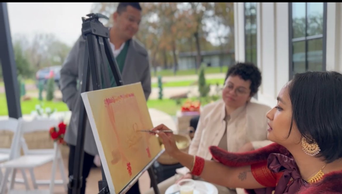 It’s a performance. It’s thrilling for me, as the artist, to paint in real-time. It’s vulnerable. When the event starts, and the music flows, I begin. I grab my paint brush, scan the colors and pick the one that speaks to me. And off I go.